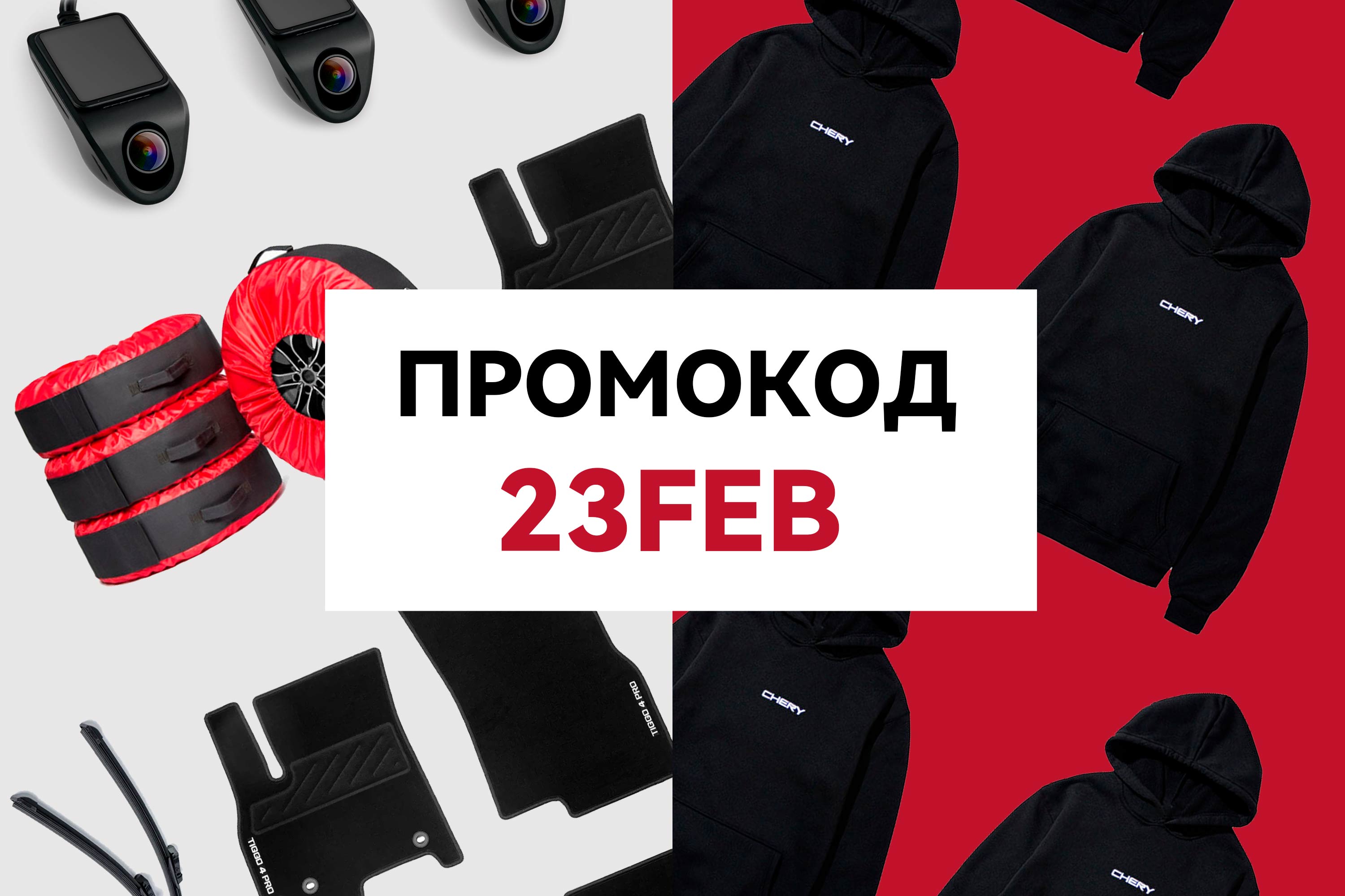 • Промокод 23FEB на скидку 30% при оформлении заказа в интернет- магазине CHERY действует на любую сумму заказа и на весь ассортимент, представленный на сайте shop.chery.ru.